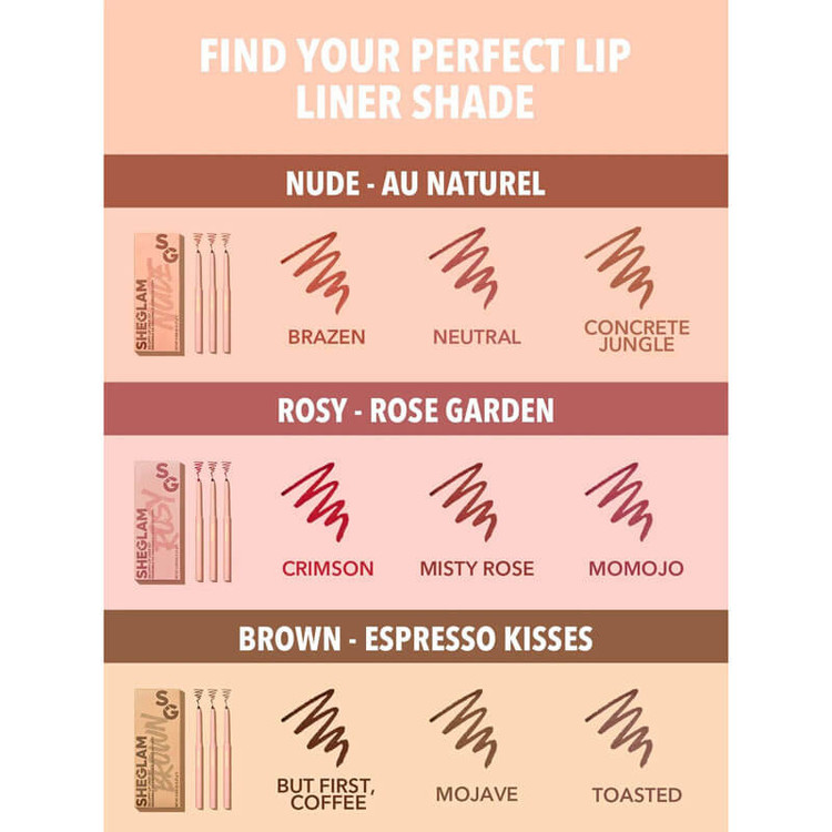 ست 3 عددی مداد لب شیگلم SHEGLAM مدل SO LIPPY رنگ Espresso Kiss دارای سه رنگ بسیار اشباع با بافتی نرم و موس مانند است که روی لب می لغزد و فینیش مات مخملی را روی لب ها ایجاد می کند. میتوانید برای استفاده از رژلب در این کنار این محصول از رژهای سری matte allure شیگلم استفاده کنید تا جلوه ای زیبا به لب ها بدهید. میتوانید با استفاده از این مدادهای فوق العاده آسان لب های خود را خط بکشید، پر کنید و سایه بزنید!